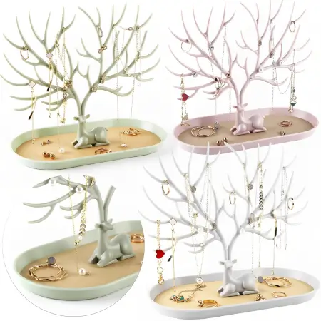1.SHAPE – This jewelry stand is designed to like a deer with branching antlers. Portable and detachable design, comes in 3 pieces including bottom tray, antlers and drawer box, can storge a lot of normal jewelry