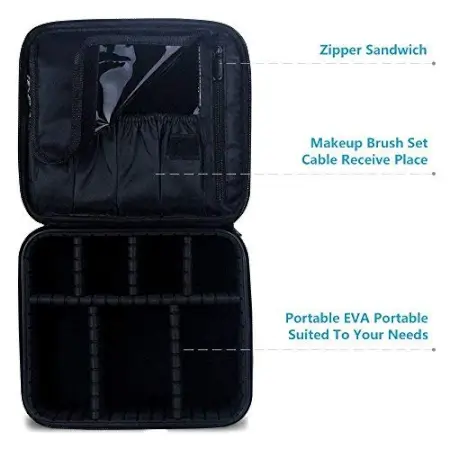 🌠 UNIQUE AND EXQUISITE DESIGN ?Main compartment includes 6 adjustable EVA dividers,You can design yourself internal compartments by the adjustable padded dividers and separate and organize all of your cosmetics, makeup tools, toiletry jewelry;Makeup brushes holder with plastic cover, not afraid of the residual cosmetics on the brush.