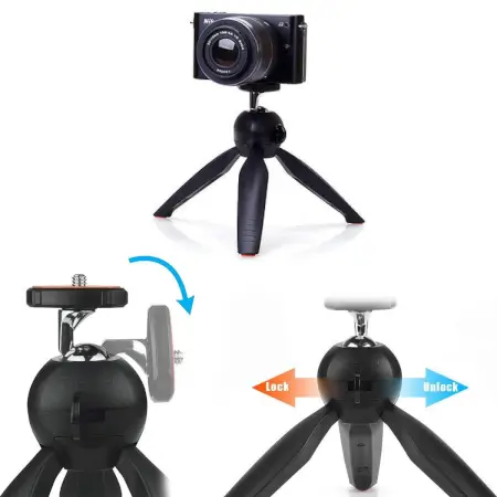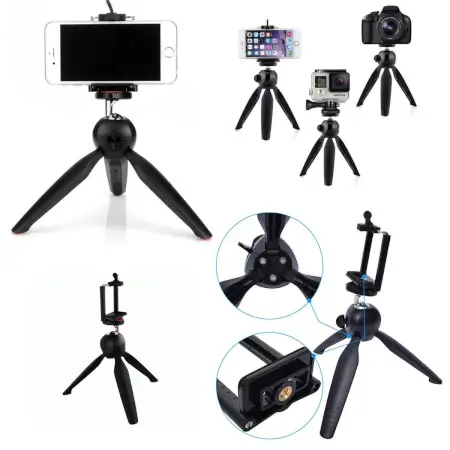 Universal Mini Tripod gimbal The mini tripod is designed to satisfy the needs of those consumers who are looking for a support which is portable, lightweight, and easy to use. Its perfect for achieving hard to get video shots or take photos while keeping your camera or smartphone steady. Or just close the legs to use it as a comfortable grip to capture great videos or photos that stand out from the crowd. The new push-button mechanism enables you to position and lock the ball head in one rapid, intuitive movement. Pushing the button releases the ball joint to move freely. When the button is released, the ball is locked automatically in the selected position. While youre using your pico projector for watching films, using smartphone for making videos, or using your webcam for live streaming, the mini tripod will be your ideal companion. So just add it to your cart and get a try. Mini Tripod Adjustable-angle by 360-degree rotation by push-bottom, fast to set up, easy to fasten; silica gel anti-skid pads on the legs bottom prevent it from sliding, very sturdy and compact Smartphone Holder 5.8 to 10.5 cm of adjustable width, attachable to any regular-size smartphone, tripod, mono pod or pico projector; two standard 14 screw thread interfaces meeting your various needs. Small and compact enough that you can fit it in your pocket. Product Features Portable and lightweight Mini Travel Tripod to go along with your digital camera Light weight and cute small size is ideal for carry in travel Well deigned pan head makes it easy to suitable for all cameras and digital cameras Solid and Stable Folding Tripod l Open the two legs of the Digital Camera Tripod Press the purple round button to release pan head for adjustment Digital Camera Travel Tripod can be used on small size ball head, changed to be a convenient handle Size: 16cm long when folded, 9.5cm long when opened, Weight: 133g Specification Folded Height : 6.5 inch to 11.7 inch (16.5 cm to 29.7 cm) Placing Height : 4.9 inch to 8.8 inch (12.5 cm to 22.4 cm) Load Capacity : 4.4 lbs (2 kg) Weight : 0.2 lbs (230) Material : Premium ABS and Steel